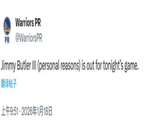 在这场比赛正式开打前,勇士官方晒出了本场首发阵容,巴特勒还在其中。但比赛开打后,理查德顶替巴特勒首发,巴特勒也没有出现在场边。直到比赛打了快半节,勇士官方才发布公告:巴特勒因个人原因将缺席今天的比赛。